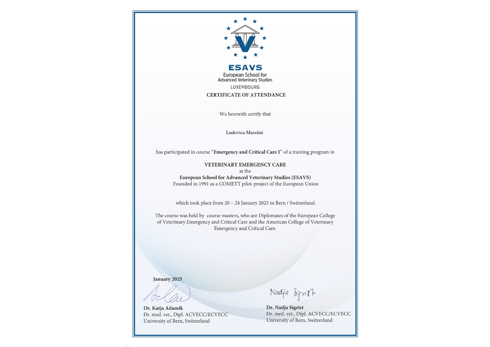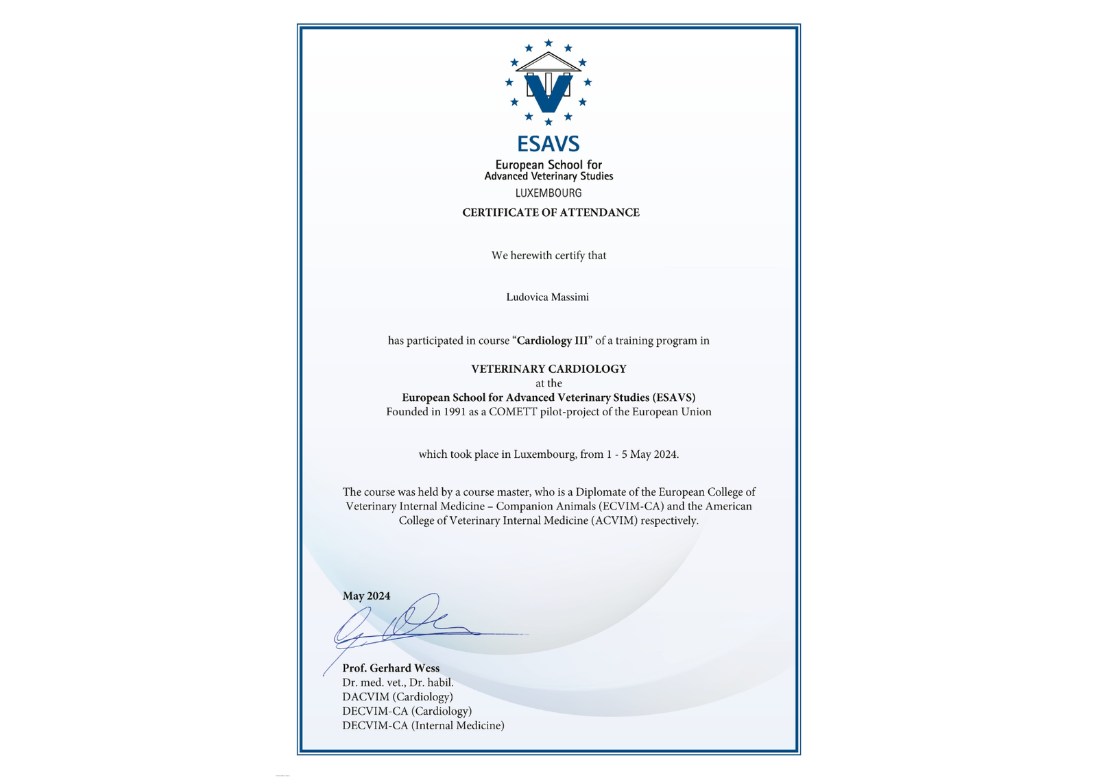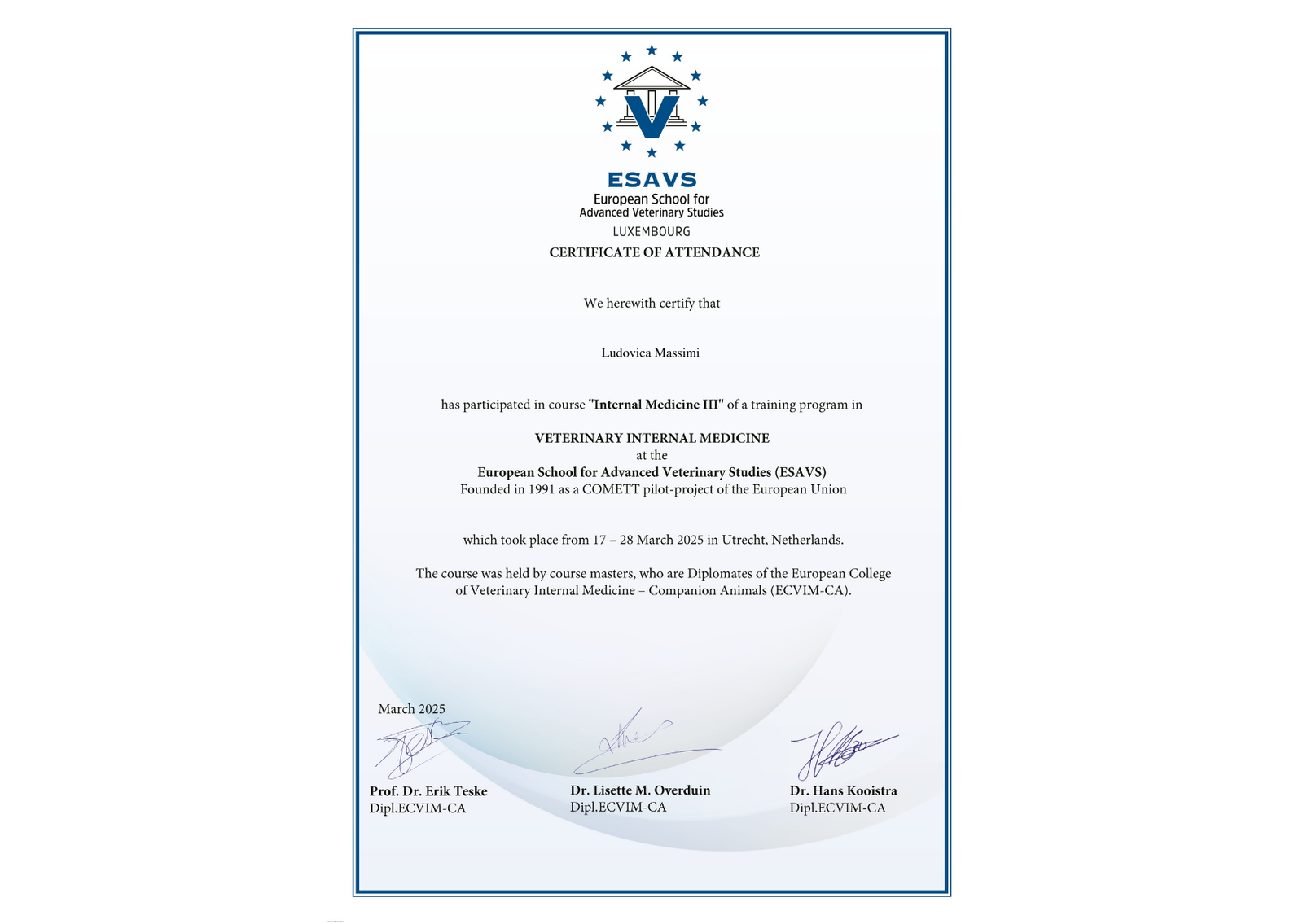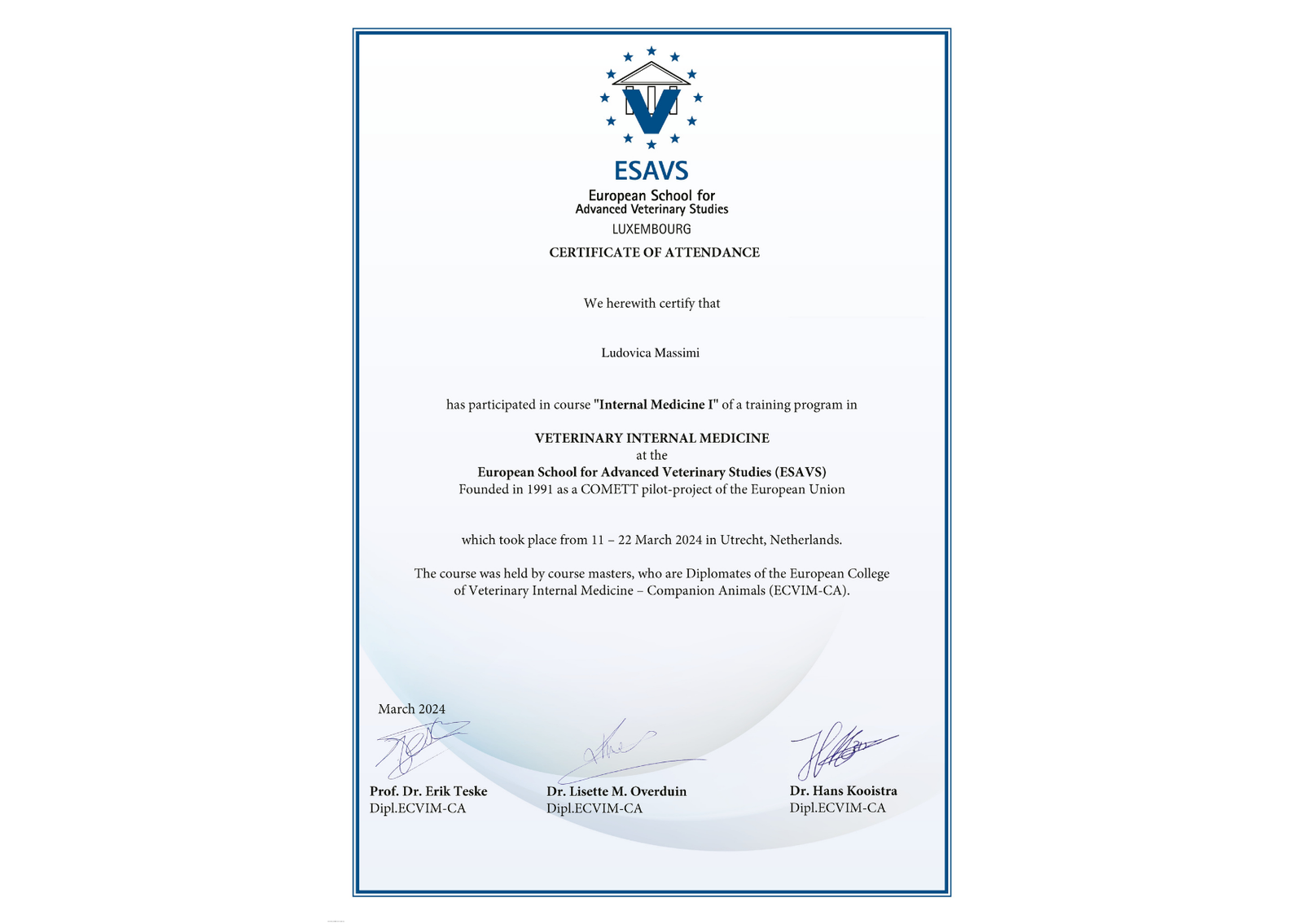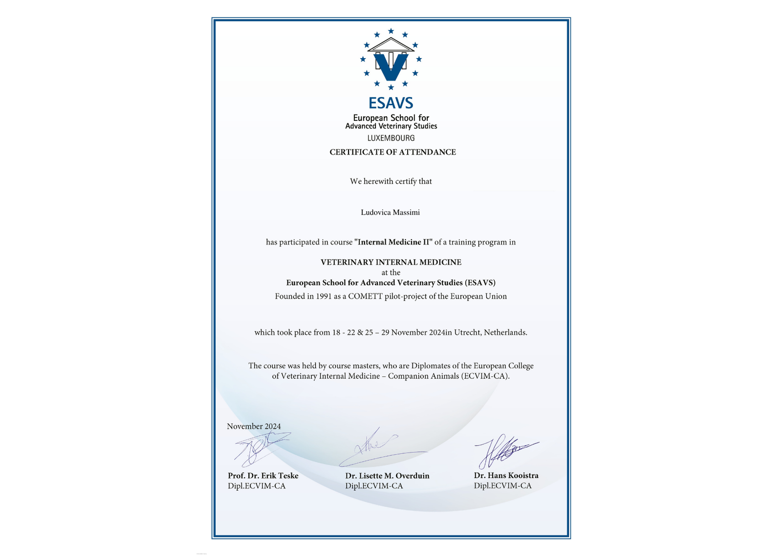 I’m Ludovica Massimi, an Italian veterinarian passionate about caring for animals and supporting their owners. My love for animals began when I was just four years old, growing up surrounded by horses, cats, and dogs - a passion I inherited from my father. Caring for animals has always been more than a profession for me; it’s a way to honor the bond we share with them and, in my case, to remember my father, whose influence continues to inspire me every day. Opening my own clinic is a dream come true and a tribute to him, bringing together everything I’ve learned over more than ten years as a veterinarian in Italy and the Netherlands.